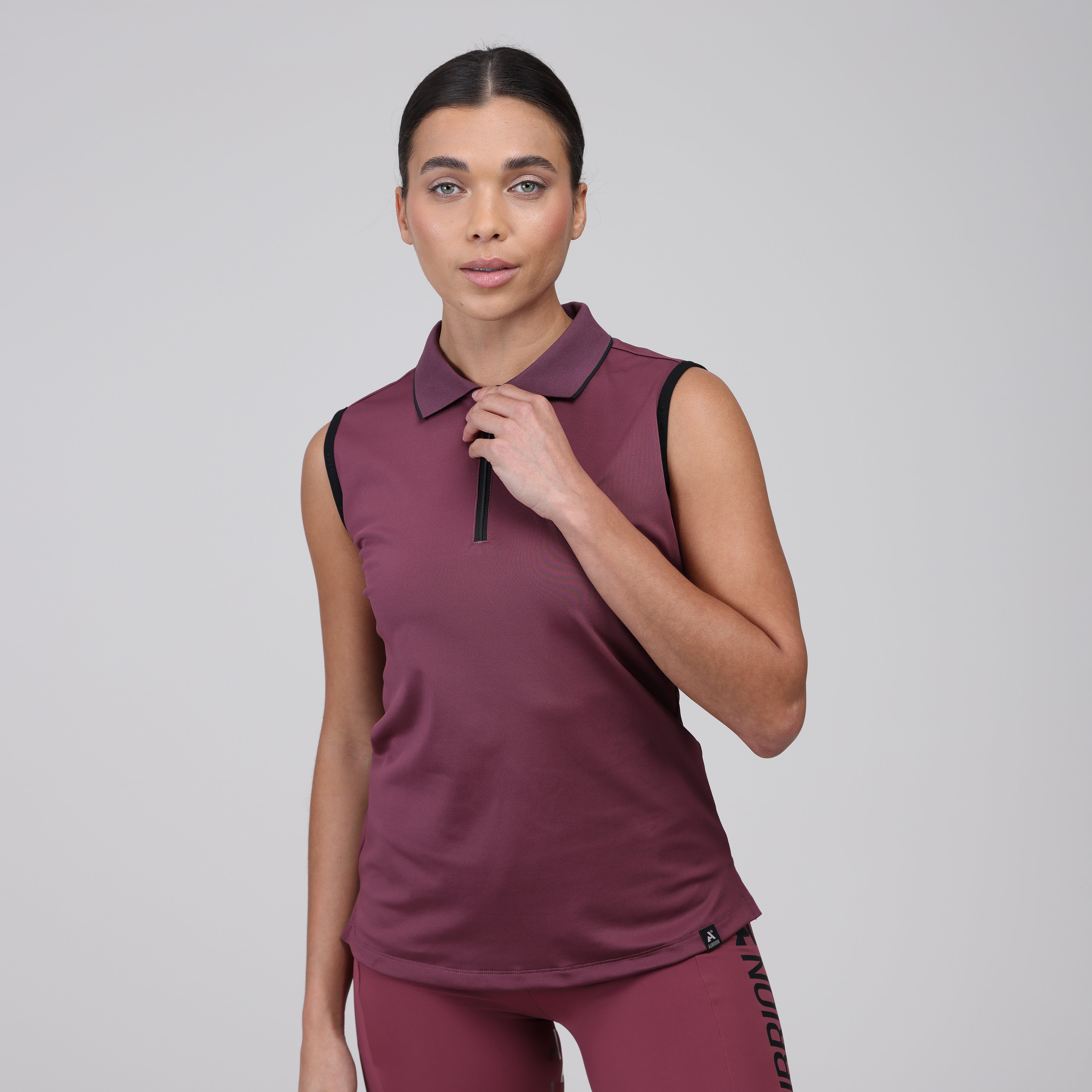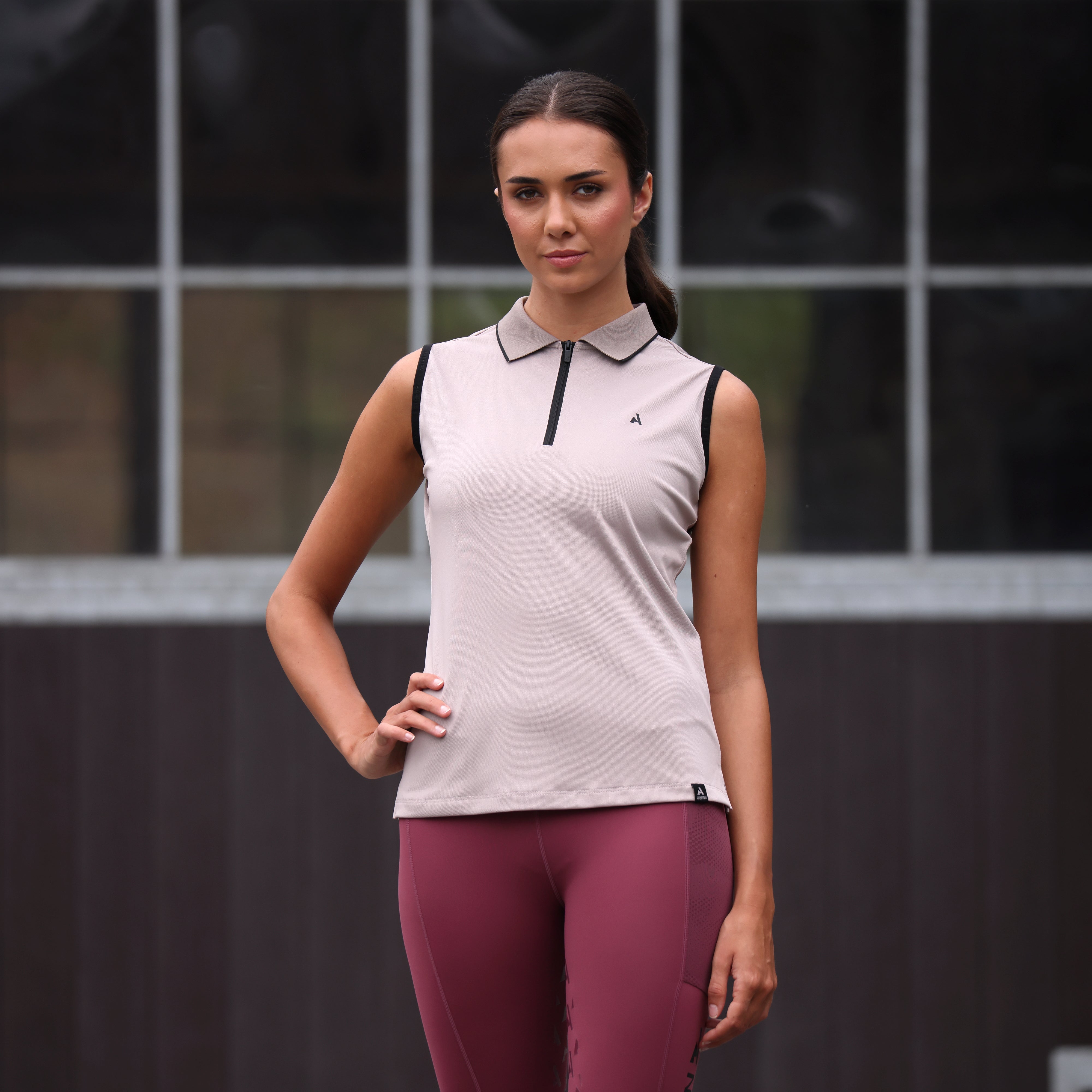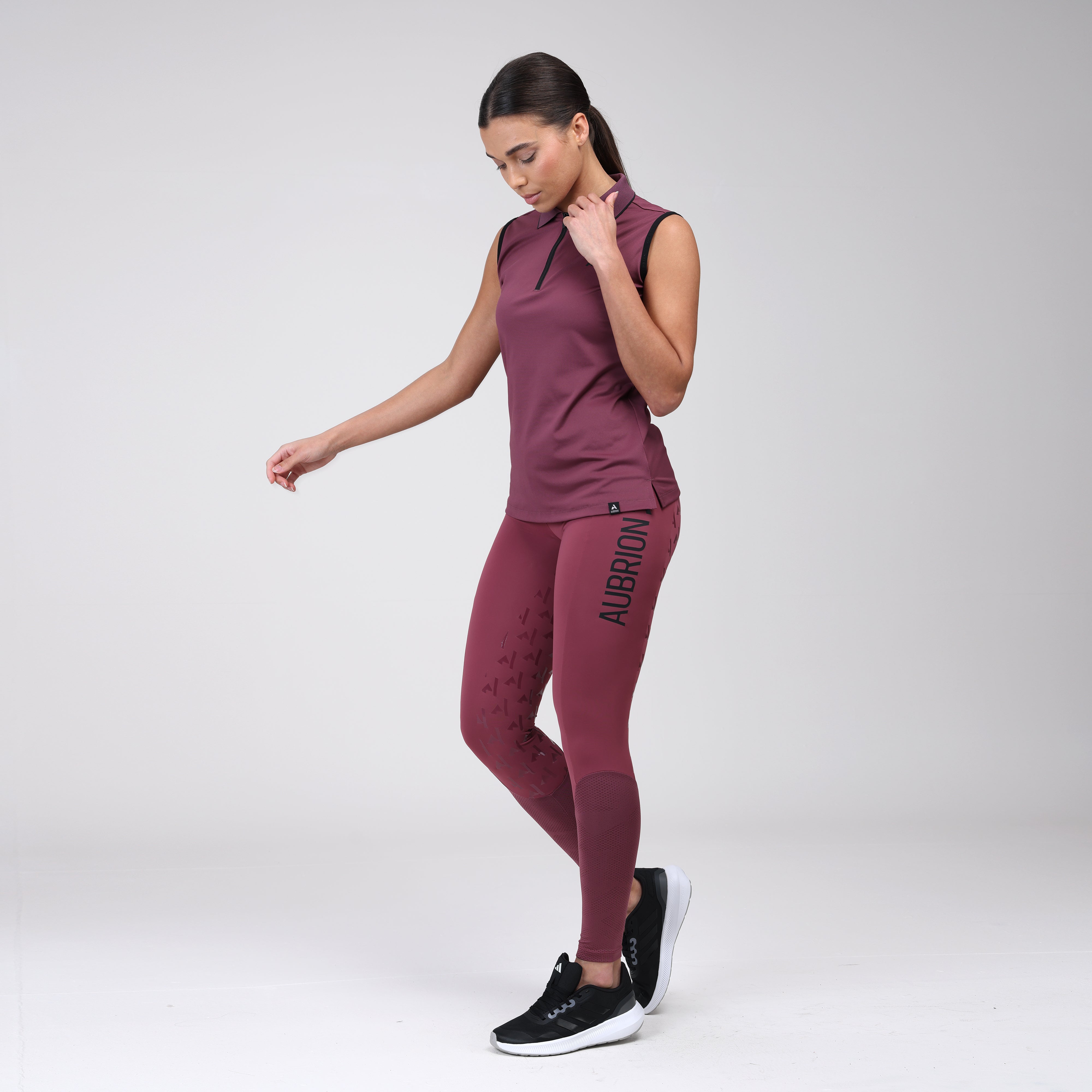 When the heat is on and you’re busy with summer riding activities, the Tech Polo is your perfect activewear go-to. The airy knit is constructed from wicking, quick-dry polyester which remain comfortable against the skin, cool drying breezes can flow through and help move the heat away. Light stretch for ease of movement, the sleeveless version features soft signature trims to avoid chafing. The zip neck allows extra ventilation, and the polo collar gives a smart look. Key features: airy knit, wicking and quick drying, light stretch, ¼ zip, polo collar, split side hems, Aubrion React logo prints.