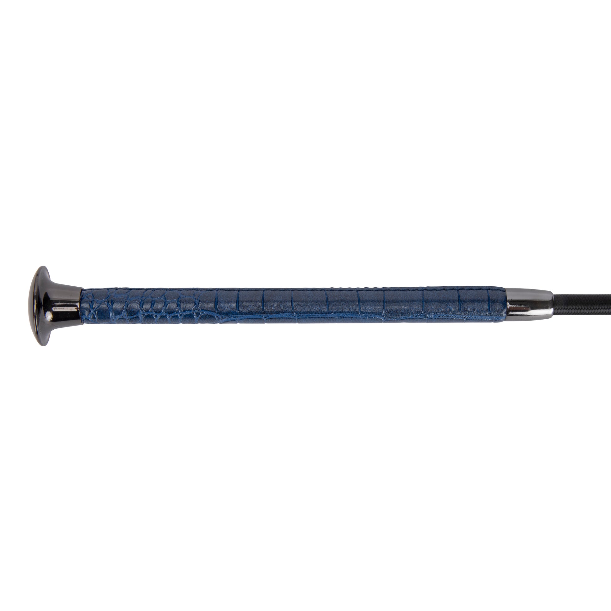 Classy and elegant, the deluxe schooling whip features a slim faux leather handle with an elegant silver colour mushroom top and lower band. The woven thread stem ends with a self-fabric lash.