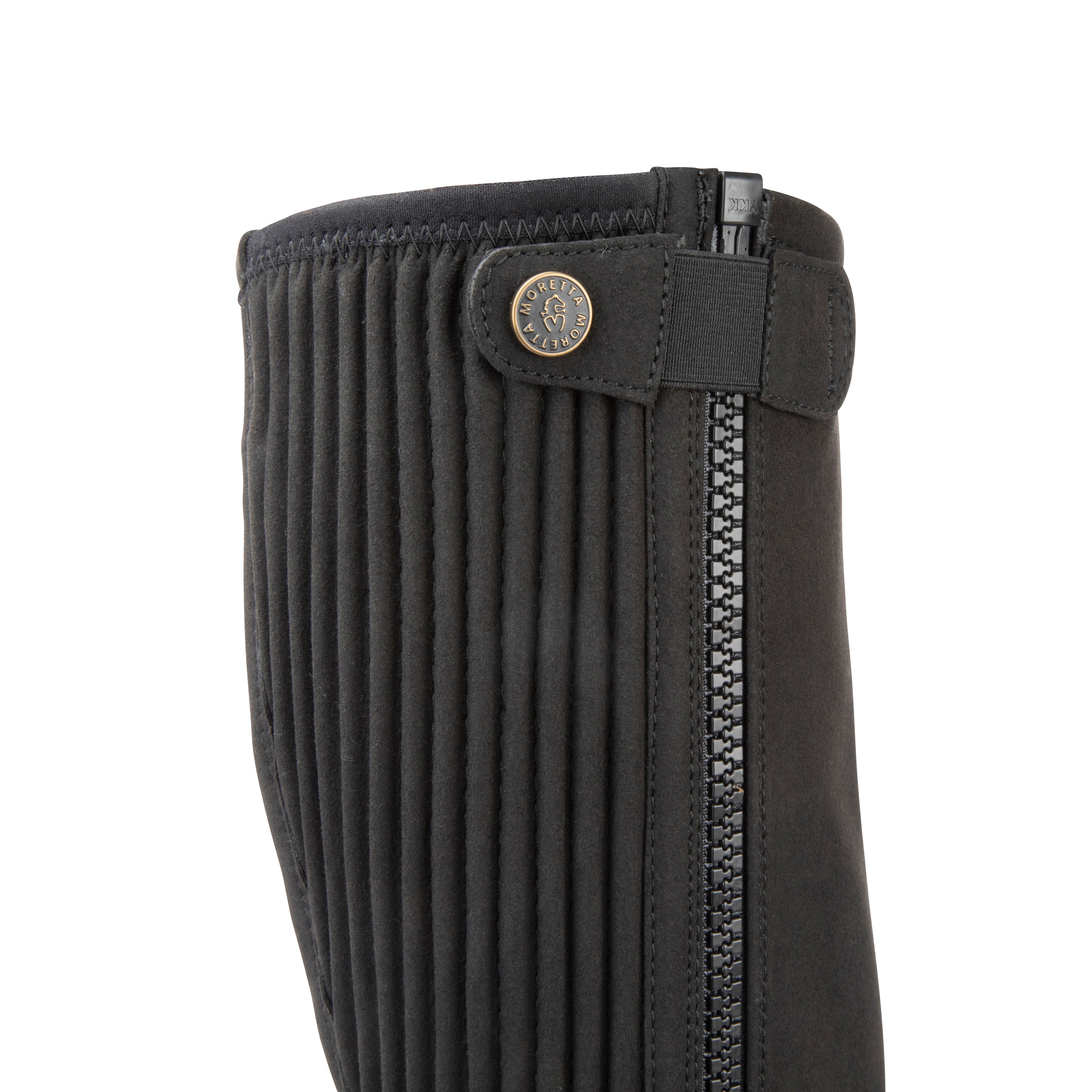 Constructed in machine washable amara fabric, Moretta half chaps offer excellent grip even when wet and great durability. The half chaps offer a tidy fit and stretch for an unrestrictive feel. Key features: UltraFit leg panel. Inner calf patches. Full length zips. Elastic foot stirrups. Stretch zip tidy straps. Neatly finished.